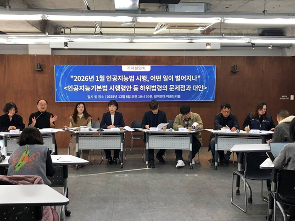 1. On Monday, December 8, 2025, at 10:30 AM, 22 labor and civil society organizations held a press briefing at PSPD’s the Areumdri Hall in Seoul to criticize the problems in the government's proposed Enforcement Decree and other subordinate regulations for the "Act on the Promotion of Artificial Intelligence Development and the Establishment of a Trust-Based Environment" (hereinafter, the 'AI Framework Act') and to call for policy alternatives from civil society. Digital rights, education, labor, culture, healthcare, and consumer groups unanimously pointed out that the subordinate regulations, which broadly exempt high-risk operators from their responsibilities, risk leaving affected people’s safety and human rights exposed to the dangers of AI.
